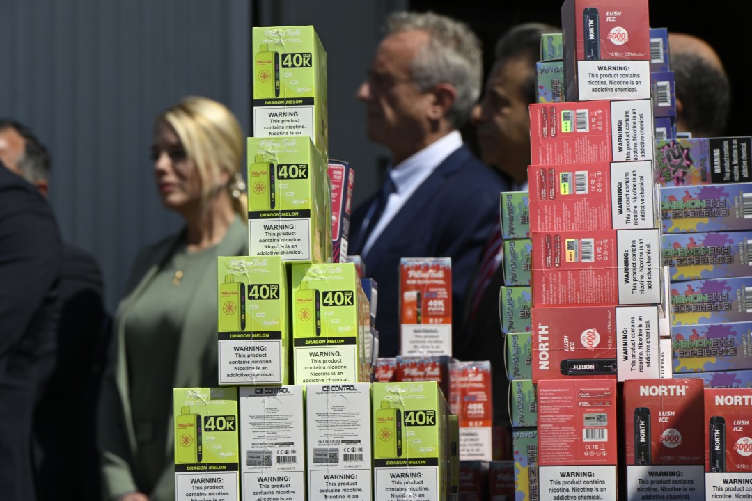 US | vaping Feds Seize More Than 600K Illegal Vapes 'They're targeting children,' Bondi says at warehouse near Chicago By Newser Editors and Wire Services Posted Sep 11, 2025 12:00 PM CDT Copied Pam Bondi and Robert F. Kennedy Jr. look on while vape products are on display in the foreground during a press conference in Bensonville, Illinois, Wednesday, Sept. 10, 2025. (AP Photo/Paul Beaty) See 2 more photos Federal agents seized hundreds of thousands of illegal vaping products in raids across the country on Wednesday as the Trump administration moved to crack down on devices that are regularly used by teens in the US. Attorney General Pam Bondi, Health and Human Services Secretary Robert F. Kennedy Jr., and other top federal officials traveled to Illinois to tout the seizures, which included more than 600,000 illegal products taken from a distributor outside of Chicago, officials said. They stood outside a warehouse flanked by colorful boxes of vapes in fruity flavors that officials say are being illegally sold at stores nationwide, the AP reports. "They're targeting children, young adults, college students and even members of our military," Bondi said. It's the latest attempt by law enforcement to staunch the flow of unauthorized vapes that have flooded into the US in kid-friendly flavors, often from China. Their influx has forced the FDA to try to eliminate thousands of illegal products sold by under-the-radar importers and distributors. The operation also targeted THC-infused vapes and products containing the illegal compound 7-OH, which has opioid-like effects, NBC News reports. Agents with the ATF, the FDA, and the US Marshals Service also seized illegal products from distributors and retailers in North Carolina, Arizona, New Jersey, Georgia, and Florida, federal officials said. The Justice Department also filed civil actions Wednesday seeking to halt illegal business practices happening at five distributors and five retailers. That follows undercover buys of illegal products that ATF agents carried out at distributors across the country last month, according to authorities. Bondi said the Justice Department would also not rule out bringing criminal charges, if warranted. "Make no mistake. Chinese companies are making billions of dollars off of these products," she said. "They're peddling them into our country." Vaping among teens skyrocketed in 2019, when more than a quarter reported using vapes daily, the AP reports. But use has declined in recent years, with fewer adolescents reporting vaping in 2024 than at any point in the last decade. Officials attributed that drop in part to more aggressive enforcement against retailers and manufacturers. The Vapor Technology Association blasted the FDA and federal officials, arguing the actions threaten to bankrupt thousands of small businesses, cost tens of thousands of jobs, and erase billions in tax revenue. In April, the Supreme Court upheld the FDA's refusal to approve flavored vapes. During his campaign last year, President Trump vowed to "save" vaping, saying he had "saved Flavored Vaping in 2019" and would do so again. Read These Next Plane windshield partially shatters mid-flight. There's a suspect. 'Butt-breathing' could be the future for struggling patients. Dem taking on Susan Collins addresses 'secret Nazi' claim. A well-known nutrition influencer died after a home birth. See 2 more photos Report an error