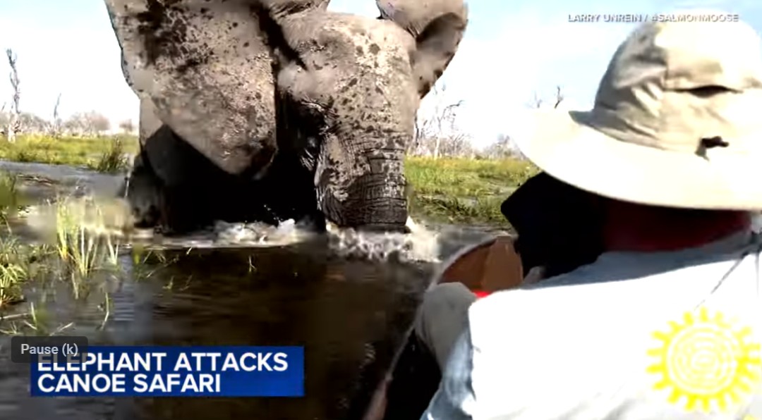 Two tourists are recounting a harrowing incident in Botswana, where their canoe safari took a sharp turn when an elephant charged at them. As Jeff Melvin and Larry Unrein tell ABC News, their group of British and American tourists approached what appeared to be a routine herd along the river while in the Okavango Delta on Sept. 27. The group could see "that they were kind of getting a little annoyed at our presence," said Melvin. But the real danger was hidden—a mother elephant with two calves, camouflaged in the tall grass.