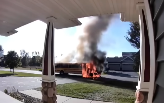 Video from Thorp's Ring doorbell shows students from East Bethel Elementary gathering in front of her house as the bus burned. "Kids were crying. Kids were scared and freaking out," Thorp says. "It was quite emotional and kind of frantic." She says the front of the bus was on fire within minutes of the evacuation, and that the entire bus was engulfed in flames within 15 minutes. She says it was "crazy" to "hear the tires explode." The heat was so intense that part of the road in front of her home was melted. Nobody was injured, but some kids lost their backpacks and other belongings. Investigators are working to determine the cause of the blaze.