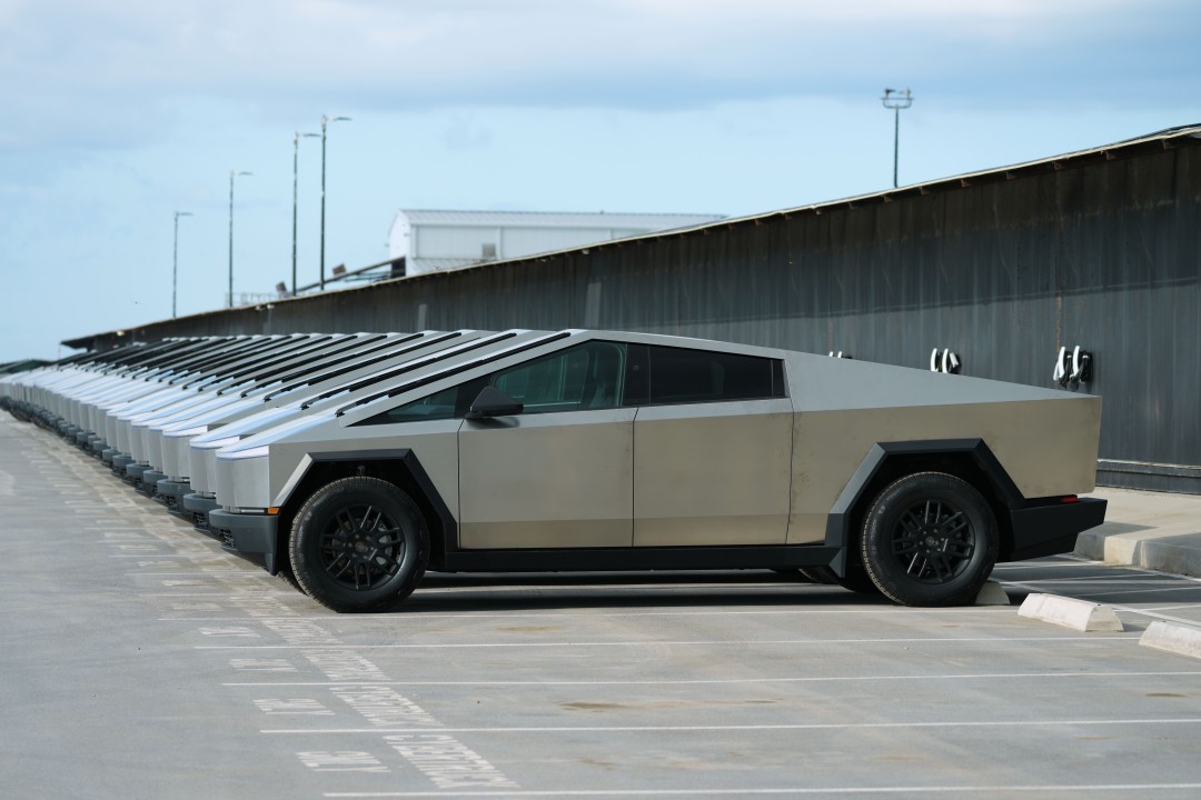 New Tesla Cybertrucks are seen at SpaceX's Starship facility in Starbase, Texas, Monday, Oct. 13, 2025.   (AP Photo/Eric Gay)